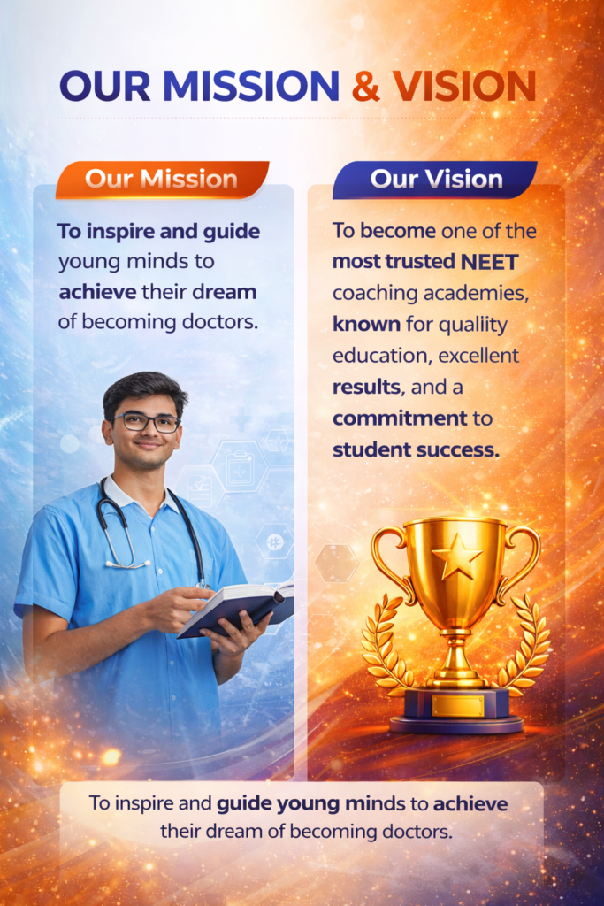 Our mission is to empower students to achieve their dreams of pursuing a career in medicine or allied health fields. With our experienced faculty, proven pedagogy, and personalized support, we provide a nurturing and stimulating environment for students to excel in their NEET exam.