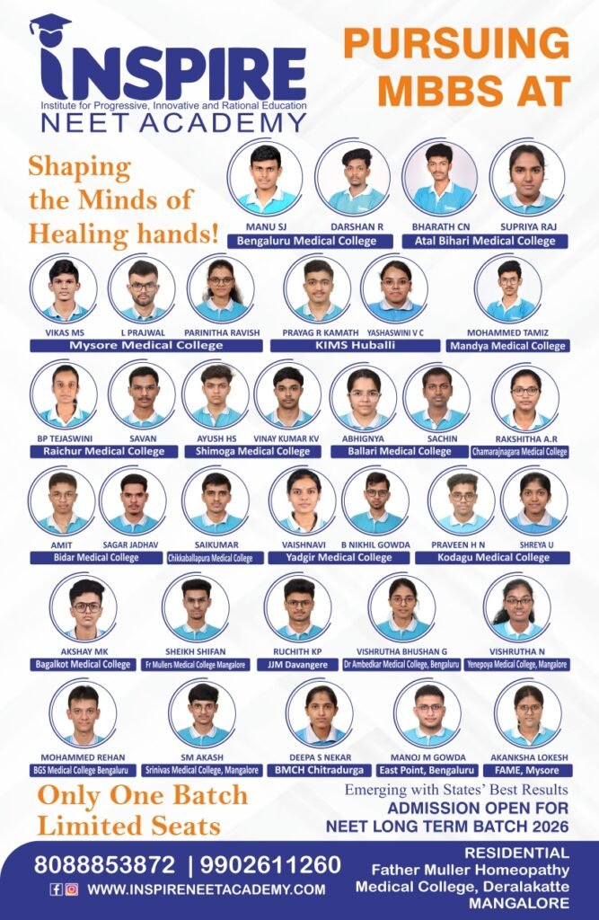 INSPIRE NEET Academy provides a focused and structured learning environment for students preparing for the NEET examination. With experienced faculty, a scientifically designed academic plan, and comprehensive study materials, we ensure that students receive the best guidance for their preparation. Our regular assessments, doubt-clearing sessions, and personalized mentorship help students strengthen their concepts and improve their performance. At INSPIRE NEET Academy, we are committed to nurturing young minds and helping them confidently achieve their dream of becoming successful medical professionals.
